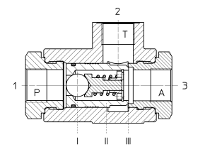 Will das Medium von 1 nach 3 strömen, so wird der Steuerkolben II durch die Vorspannung von I gegen den Sitz bei 3 geschoben. Bei ca. 2 bar öffnet I und gibt den Durchfluss nach 3 frei. Der Anschluss 2 bleibt bei gleichem Betriebsdruck durch die Differenzfläche geschlossen. Damit das Medium von 3 nach 2 oder von 2 nach 3 strömen kann, muss 1 entlastet werden und der Steuerkegel II gibt durch Abheben vom Sitz III den Durchfluss frei. Der Anschluss 1 ist über das Rückschlagventil I gesperrt.
